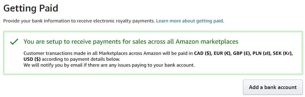 아마존 My Account 페이지 Getting Paid 메뉴에서 저자 정보를 입력하고 아래에 '아직 계좌 없음'을 선택하면 아래와 같이 표시가 됩니다.
