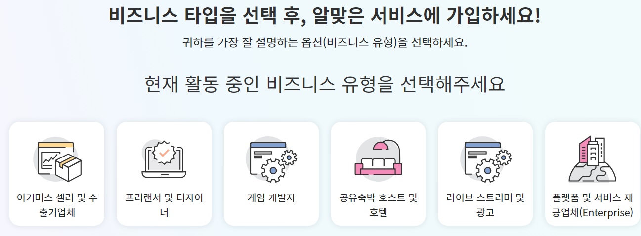 비즈니스 유형에 맞는 아이콘을 선택하면 아래의 가입 절차가 시작.